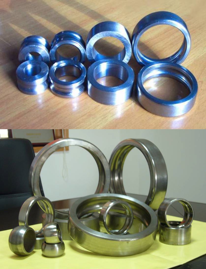 GCr15 軸承鋼含碳量為 1.0%,屬于高碳鋼,塑性差,變形抗力大,難以冷軋環(huán)成形。GCr15 軸承鋼室溫冷軋成形是國(guó)際高性能軸承環(huán)先進(jìn)制造技術(shù)發(fā)展方向,我國(guó)經(jīng)過(guò)深入研究開發(fā),發(fā)明了球軸承環(huán)精密冷軋成形方法和滾子軸承環(huán)冷軋成形方法,攻克了 GCr15 軸承鋼室溫冷軋高塑性預(yù)處理、長(zhǎng)壽命軋輥孔型設(shè)計(jì)制造、精密冷軋環(huán)過(guò)程控制等關(guān)鍵技術(shù),突破了高碳軸承鋼冷軋成形的技術(shù)禁區(qū)。精密冷軋直接成形軸承滾道,精度為 6~7 級(jí),高出國(guó)際先進(jìn)水平 1~2 級(jí)。精密冷軋軸承環(huán),節(jié)省了大量切削加工,節(jié)材 15%~20%,滾道內(nèi)部組織細(xì)密,金屬流線分布合理,顯著提高軸承壽命。此外,自主研發(fā)了新型數(shù)控精密冷軋環(huán)機(jī),創(chuàng)新性地研究設(shè)計(jì)了伺服電動(dòng)機(jī)-減速器-強(qiáng)力滾珠絲杠機(jī)構(gòu),取代液壓伺服系統(tǒng)作為冷軋環(huán)機(jī)主傳力進(jìn)給系統(tǒng),解決了爬行和零飄問(wèn)題,保持了機(jī)電伺服進(jìn)給系統(tǒng)精密進(jìn)給優(yōu)點(diǎn),實(shí)現(xiàn)了 50 t 重載塑性變形條件下的軸承環(huán)冷軋精密進(jìn)給,進(jìn)給精度達(dá)到 0.005 mm,加工精度達(dá)到φ 100 mm±0.05 mm,高于德國(guó)和日本同類型精密冷軋環(huán)機(jī)加工精度φ 100 mm±0.1 mm。應(yīng)用精密冷軋技術(shù)和裝備批量生產(chǎn)的軸承環(huán)不僅替代進(jìn)口,還大量出口瑞典 SKF、德國(guó) FAG、日本 NSK、美國(guó) TIMKEN 等國(guó)際著名軸承公司,實(shí)現(xiàn)了軸承環(huán)制造從熱鍛低性能粗坯到冷軋高性能精坯的重大技術(shù)突破。精密冷軋成形的典型軸承環(huán)如下圖 所示。