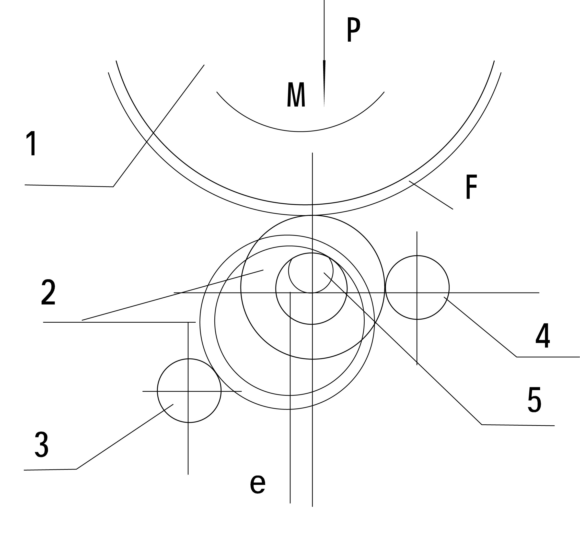輾環(huán)機工作原理如上圖所示。溫度符合要求的環(huán)坯2套到輾壓輥5上,旋轉(zhuǎn)著的輾壓輪1在油缸力P的作用下向下運動,與環(huán)坯接觸后,環(huán)坯開始變形。此時環(huán)坯和碾壓輥在摩擦力F的作用下旋轉(zhuǎn),環(huán)坯受到壓縮,壁厚逐漸減薄,金屬沿切線方向延伸(軸向也有少量展寬),環(huán)坯的延伸變形處于自由狀態(tài)。當(dāng)環(huán)坯外徑與固定的推力輥4接觸后,推力輥的反作用力使環(huán)坯外徑增大的同時,產(chǎn)生彎曲變形,將環(huán)坯的幾何中心推向機器中心線的左方,并使輾擴過程平穩(wěn)地進行。當(dāng)環(huán)坯的外徑增大到予先調(diào)整好的信號輥3時,輾壓輪即可向上回程,鍛件卸出,完成一次工作循環(huán)。